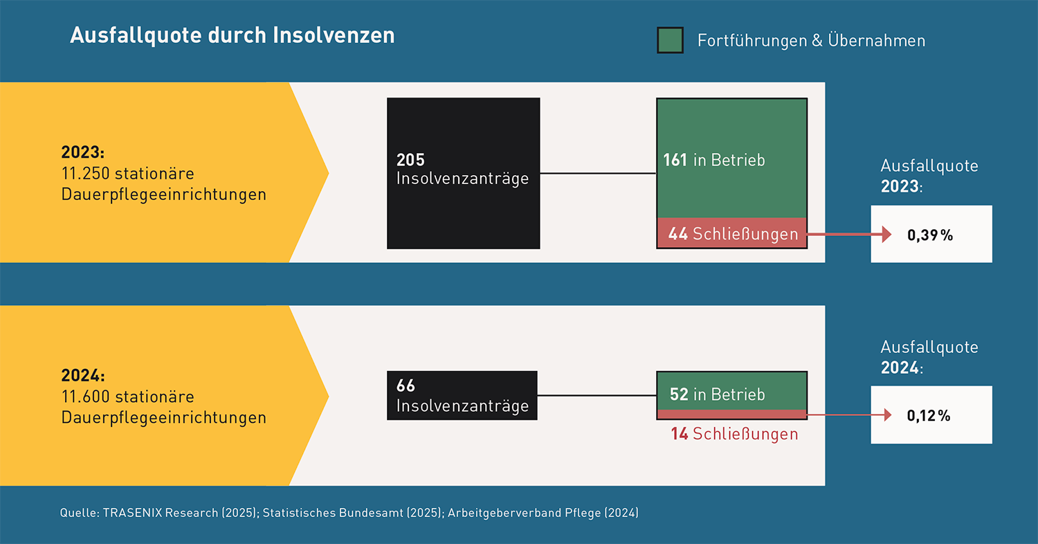 Die Zahlen sprechen für sich: 2023 meldeten bundesweit 205 von 11.250 stationären Pflegeeinrichtungen Insolvenz an. Davon wurden lediglich 44 Häuser endgültig geschlossen, rund 80 % der betroffenen Einrichtungen blieben durch Fortführung oder Übernahme in Betrieb. 2024 waren es bei 11.600 Einrichtungen nur 66 Insolvenzen mit 14 dauerhaften Schließungen – 78 % der Betriebe liefen weiter. Die Ausfallquote lag damit bei lediglich 0,39 % (2023)und 0,12 % (2024).